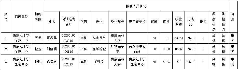 根据《南京市卫生健康委员会、南京市机关事务管理局所属部分事业单位2020年公开招聘卫技人员公告》(宁事招公告(R)[2020]33号)文件要求,经过笔试、面试、体检、考察等程序,现将拟聘用人员名单进行公示。公示期为7个工作日,自2020 年11月24日至2020年12月2日。对公示名单如有异议,请于公示期内反映。