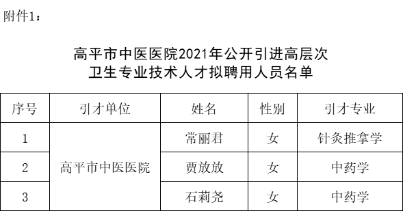 附件1:高平市中医医院2021年公开引进高层次卫生专业技术人才拟聘用人员名单