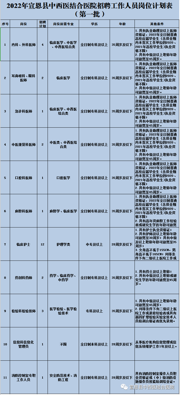 原文标题:2022年宣恩县中西医结合医院招聘工作人员公告(第一批)
