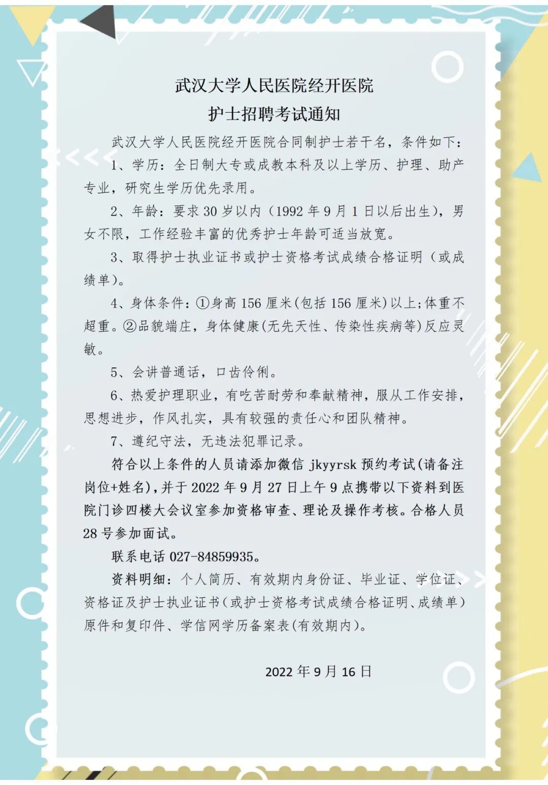 武汉大学人民医院经开医院护士招聘考试通知